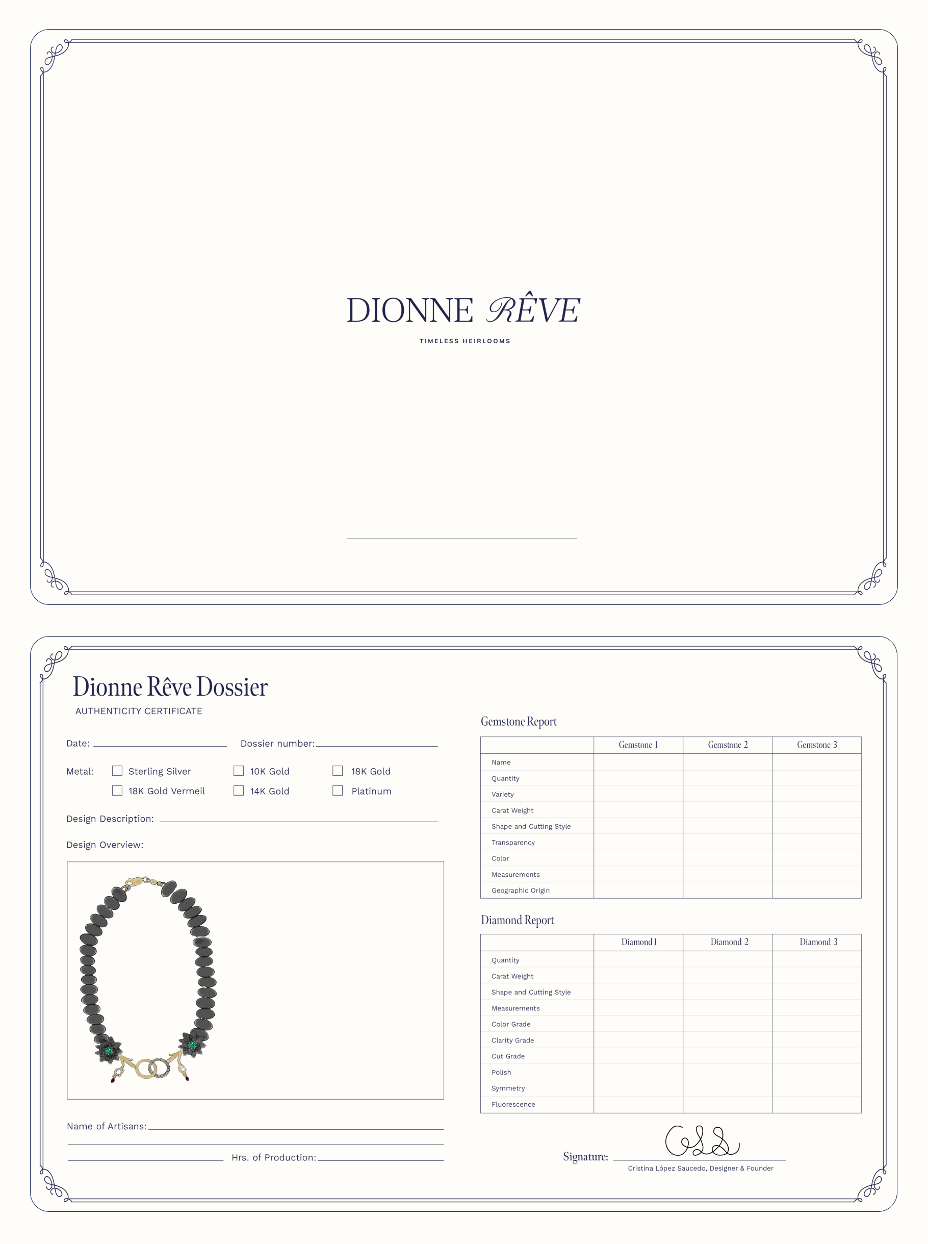 Un documento especial que acompaña a cada pieza de joyería hecha a medida, certificando su autenticidad y detallando las piedras preciosas utilizadas. También explica el significado detrás de cada elemento de diseño, mostrando cómo se eligió cada detalle para reflejar su historia única. El dossier incluye los bocetos originales de nuestra fundadora, Cristina López Saucedo, que ofrecen una visión del viaje creativo detrás de su pieza única. Es un homenaje duradero a la artesanía y refleja la conexión personal de cada diseño.